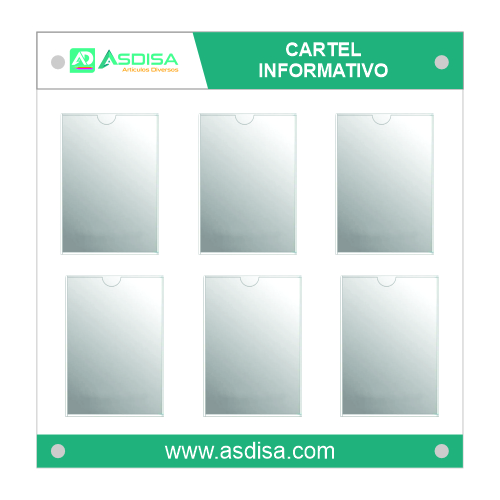 Este porta afiche acrílico mural está diseñado para mostrar hasta seis afiches tamaño A4 de forma clara, profesional y organizada. Ideal para oficinas, clínicas, instituciones educativas o comerciales que necesitan exhibir información variada en un solo soporte.